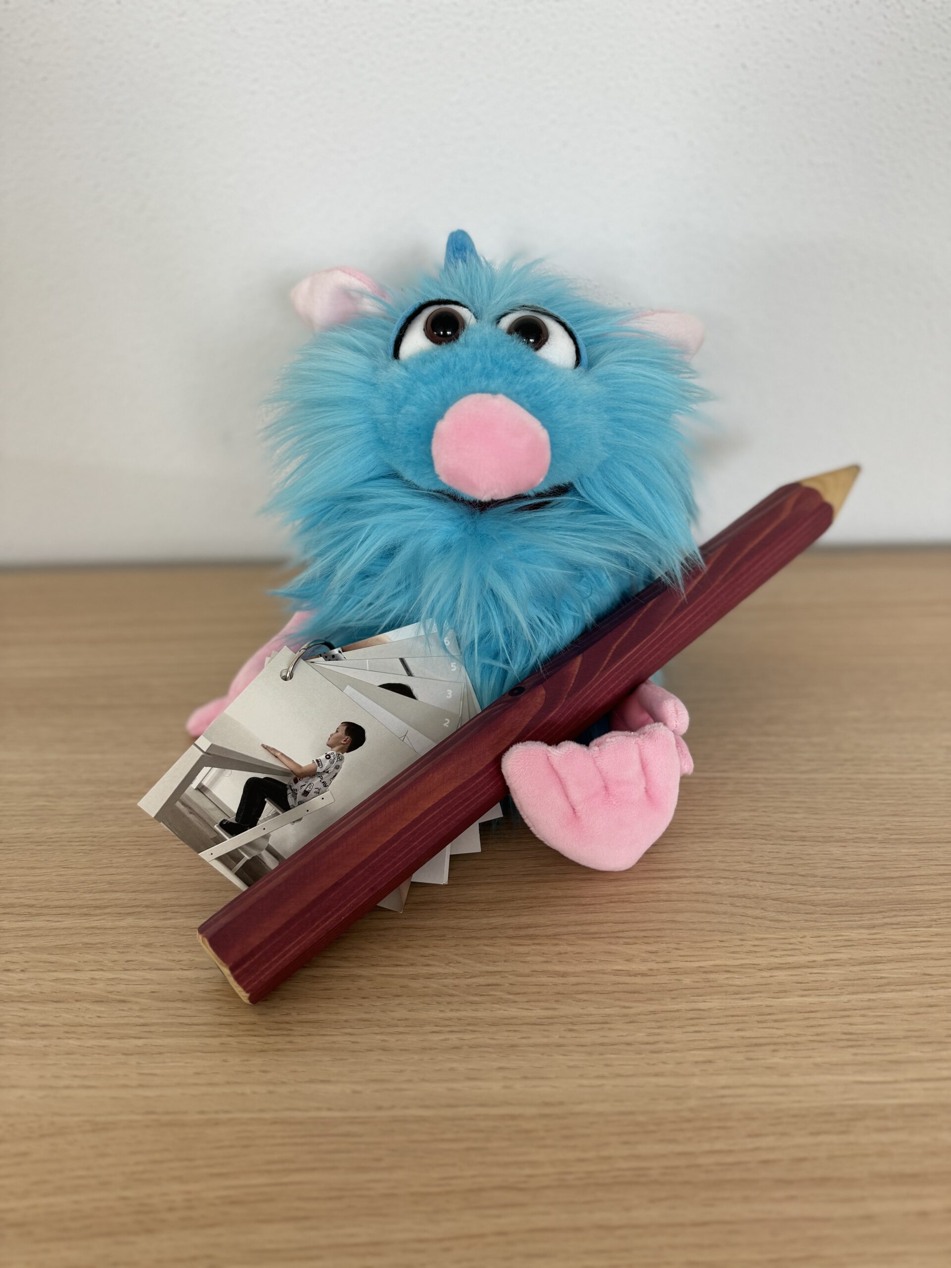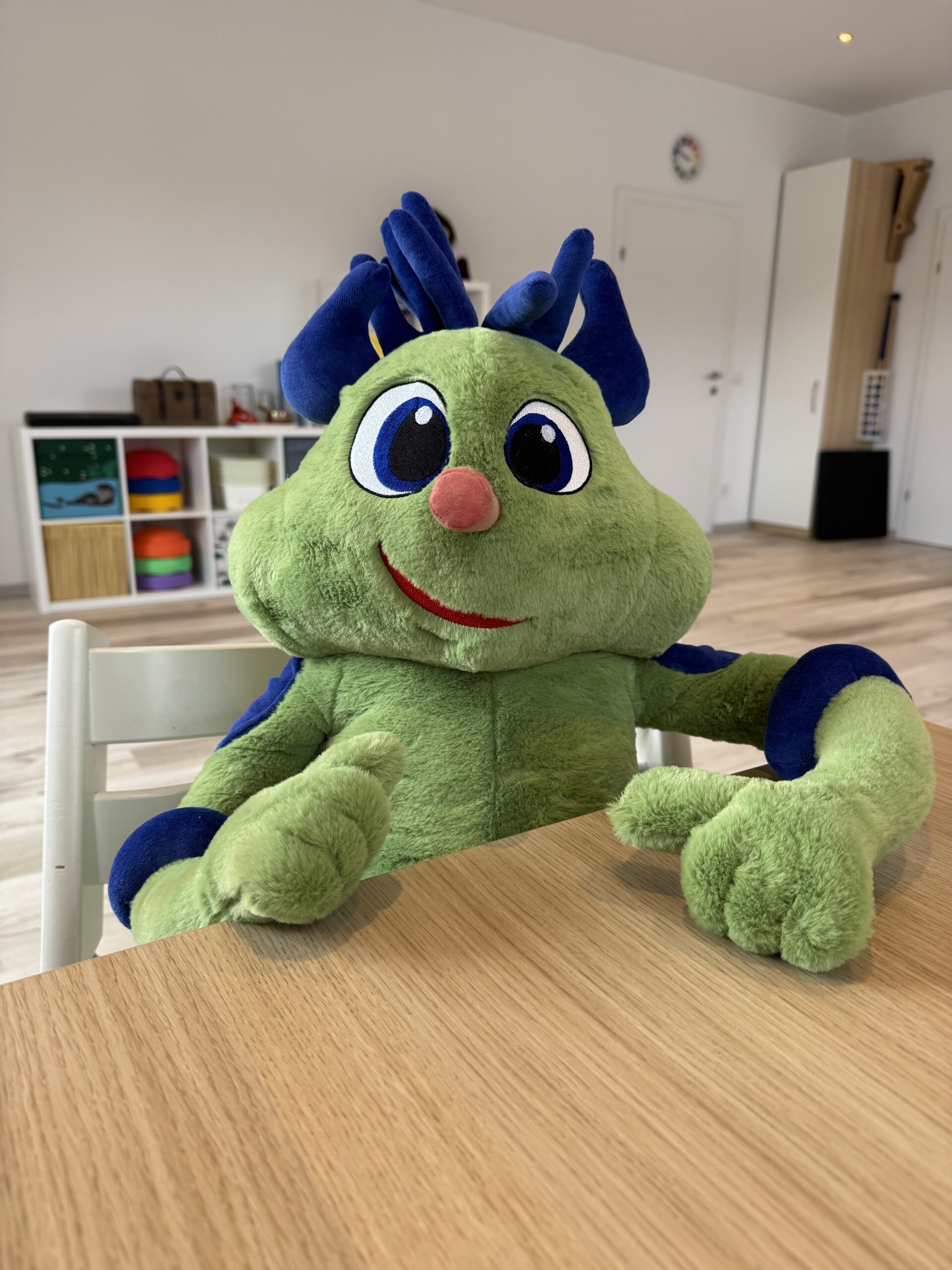 RoXie ist ein kleines blaues Monster – flauschig, neugierig und immer ein bisschen aufgeregt, wenn er neue Kinder kennenlernt.